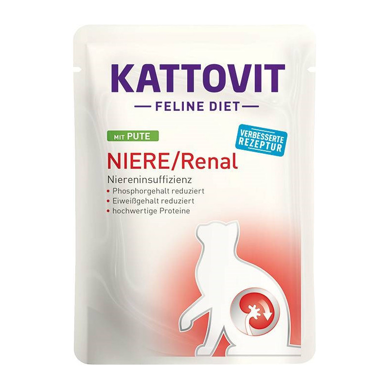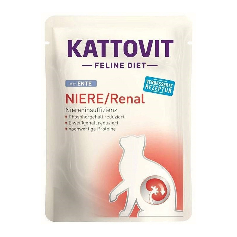 KATTOVIT Feline Diet Niere/Renal yra drėgnas kačių maistas, sukurtas suaugusioms katėms, turinčioms inkstų problemų, tiekiamas 12 pakelių po 85g. Pagrindiniai skoniai yra jautiena, vištiena, kalakutiena ir antiena.
