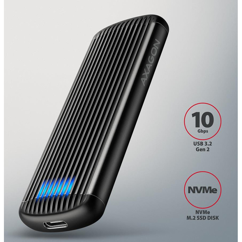 Išorinė aliumininė AXAGON EEM2-SC RIBBED dėžutė su USB 10Gbps sąsaja, skirta M.2 NVMe SSD diskams. Stabilų ir greitą ryšį užtikrina dvipusė USB-C jungtis. Pakuotėje rasite USB-C -> USB-C laidą, skirtą dėžutei prijungti prie kompiuterio.