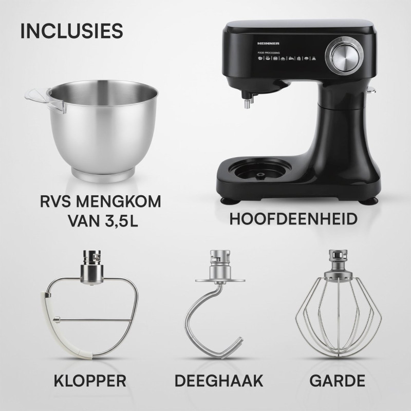 „Heinner“ stacionarus maišytuvas 600 W – 3,5 l nerūdijančio plieno maišymo dubuo – 12 greičių – pulsavimo funkcija – planetarinis maišytuvas – juodas – komplekte yra šluotelė, tešlos minkymo kablis