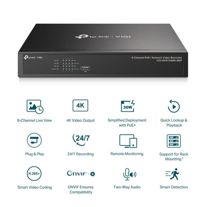 TP-LINK VIGI NVR1008H-8MP turi 8 PoE+ prievadus ir palaiko vaizdo dekodavimą iki 16MP su 4K HDMI išvestimi. Jis leidžia vienu metu peržiūrėti vaizdą iš 8 kamerų ir siūlo lengvą "plug-and-play" diegimą.