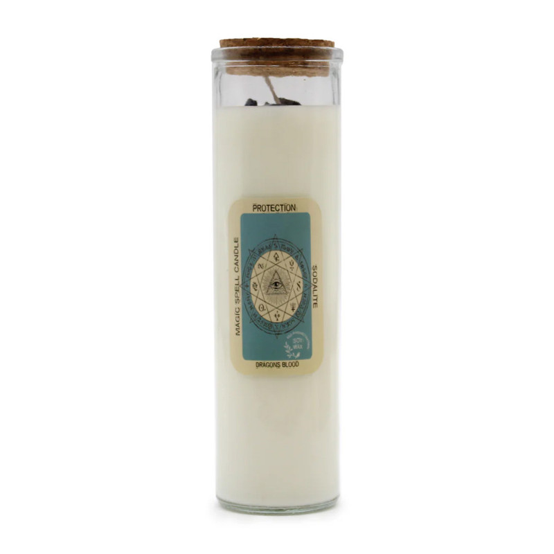 Žvakė "Magic Spell" - Apsauga AW gifts turi 50 valandų degimo laiką ir sveria 454 g su pakuote. Pagaminta iš stiklo, brangakmenių, kvapų ir sojų vaško, ji pasižymi dervos aromatu.