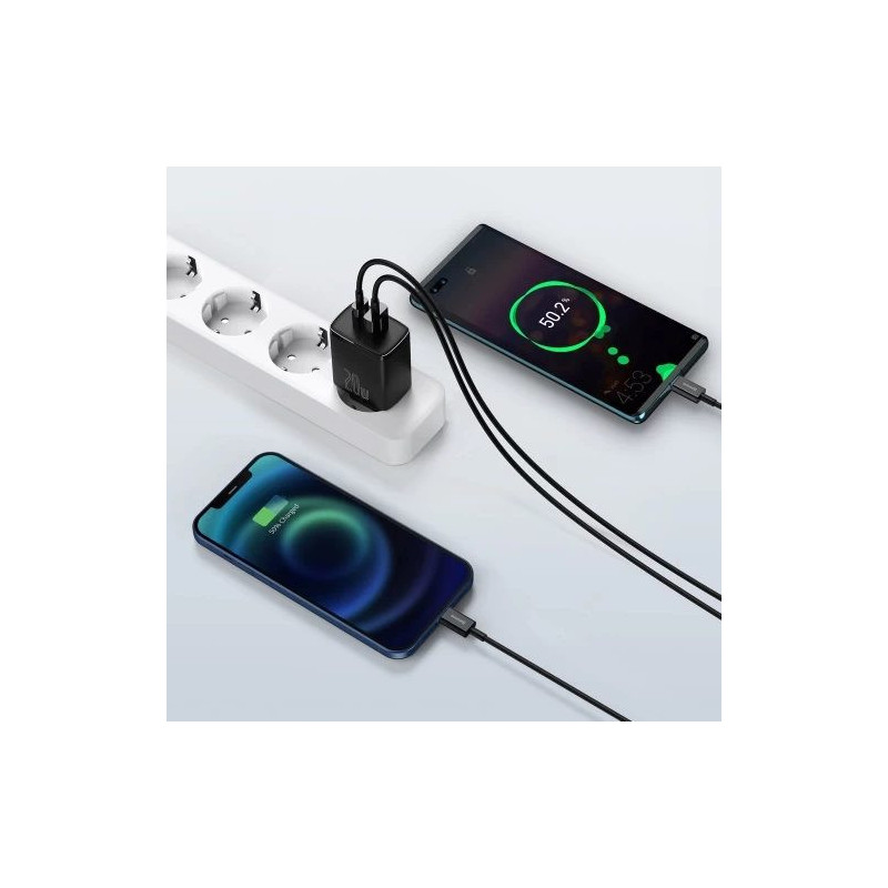 The charger from Baseus will allow you to resign from carrying two chargers with you. All thanks to a special design. In the upper part of the plug there are two USB inputs, the first one is type C, while the second is type A. Thanks to this solution, you can give up two separate chargers and replace it with one, which is definitely more practical and takes up less space in your purse or backpack. An additional advantage of this solution is the ability to charge two devices at the same time, occupying only one socket.