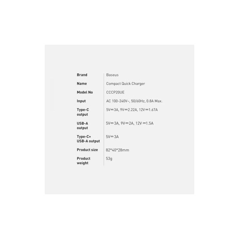 Compact quick charger Baseus U + C 20W EU