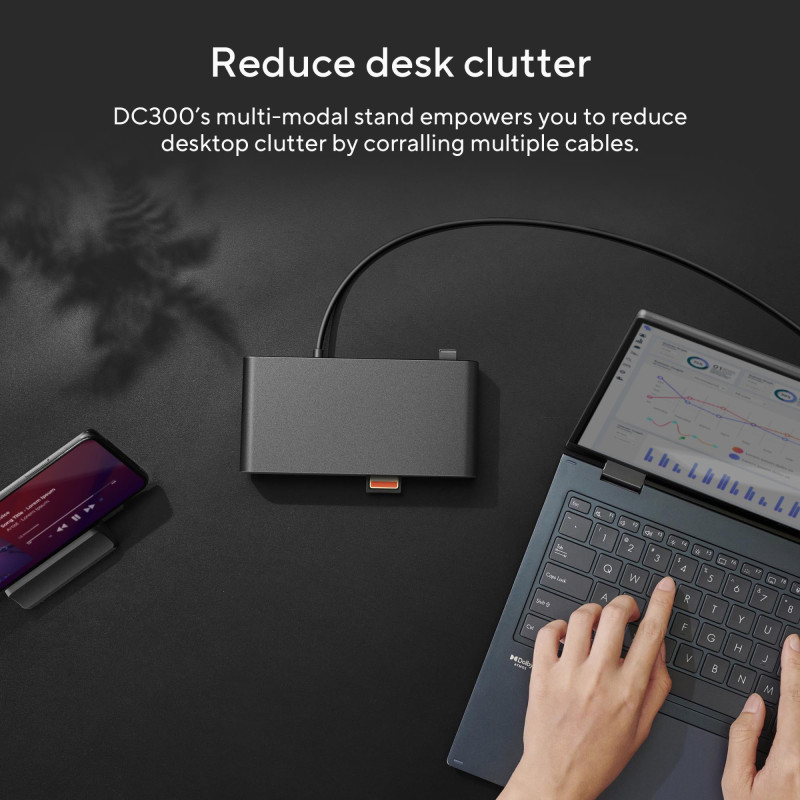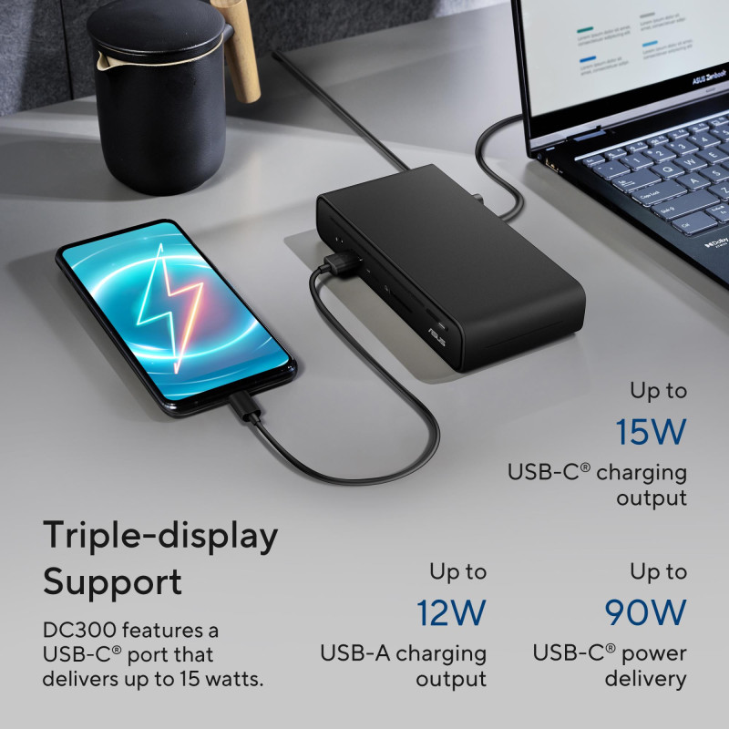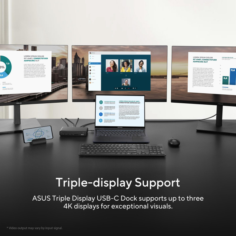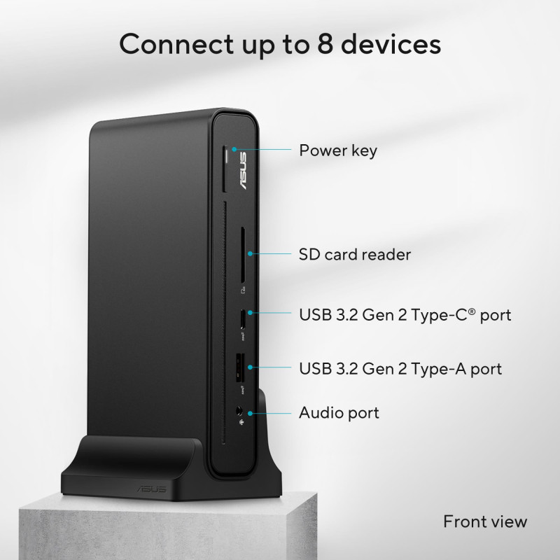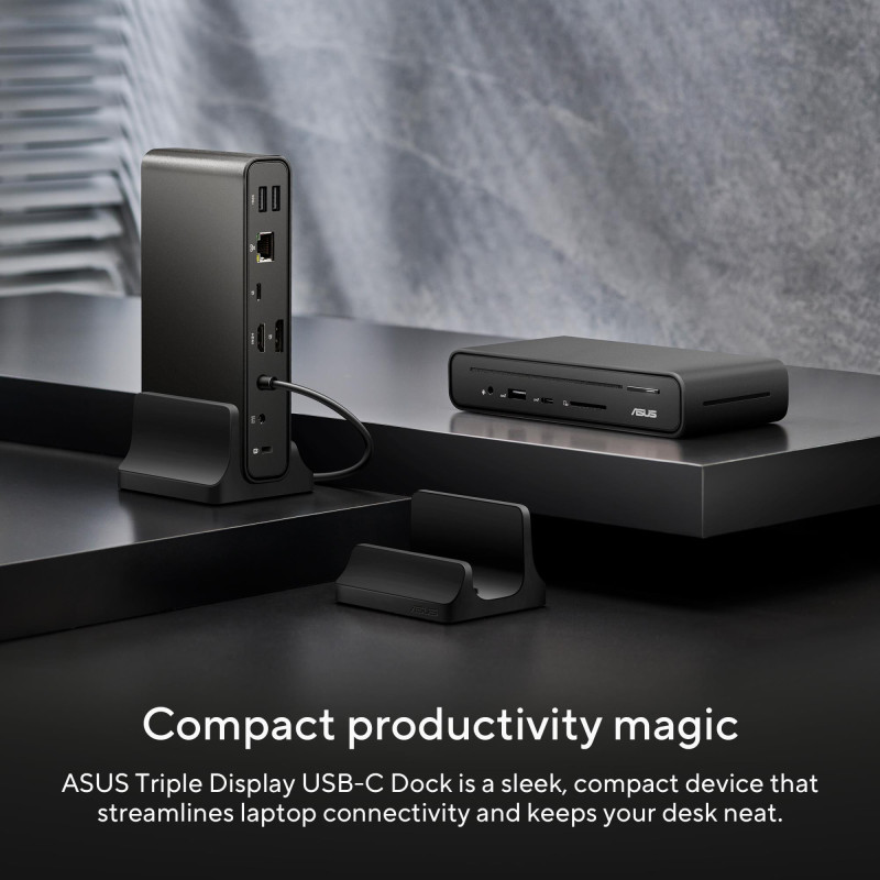 „ASUS Triple Display USB-C Dock“ yra elegantiškas, kompaktiškas ir universalus įrenginys, supaprastinantis nešiojamojo kompiuterio prijungimą. Maitinkite nešiojamąjį kompiuterį vienu laidu, prijunkite jį prie tinklo ir periferinių įrenginių ir atlikite kelias užduotis vienu metu naudodami iki keturių monitorių*1, įskaitant nešiojamojo kompiuterio monitorių ir tris išorinius monitorius. Jis taip pat turi integruotą SD kortelių skaitytuvą, skirtą įvairiems verslo scenarijams. Paprastai tariant, „ASUS Triple Display USB-C Dock“ užtikrina, kad jūsų stalas būtų tvarkingas ir organizuotas, o akimirksniu paruošia jus darbui.