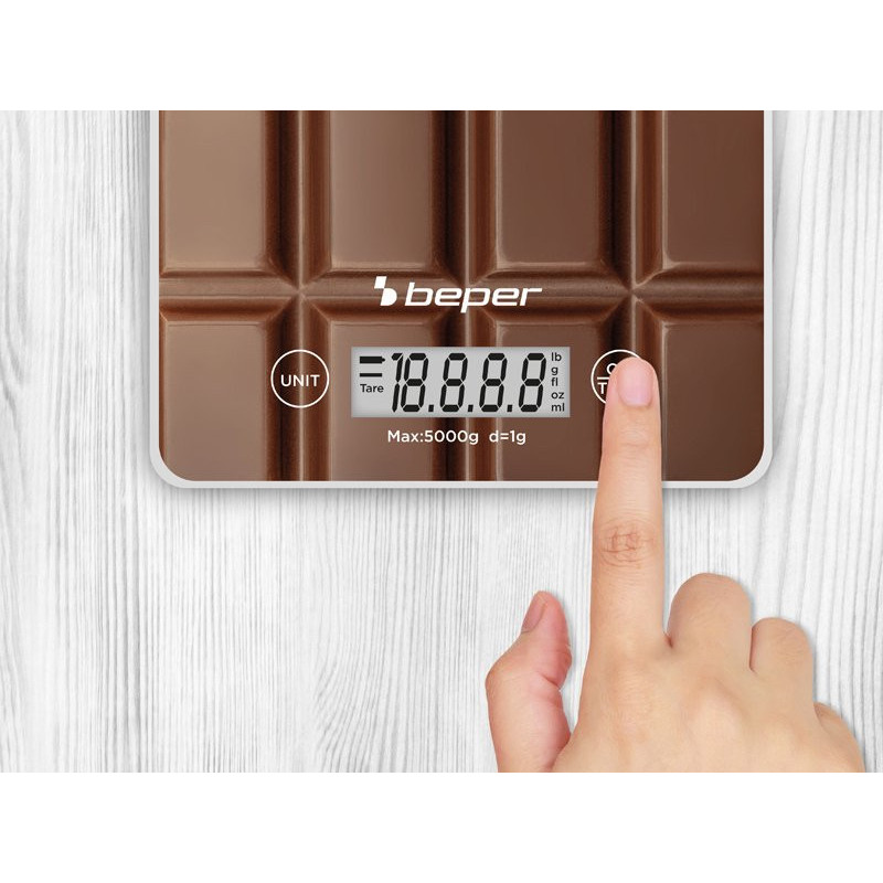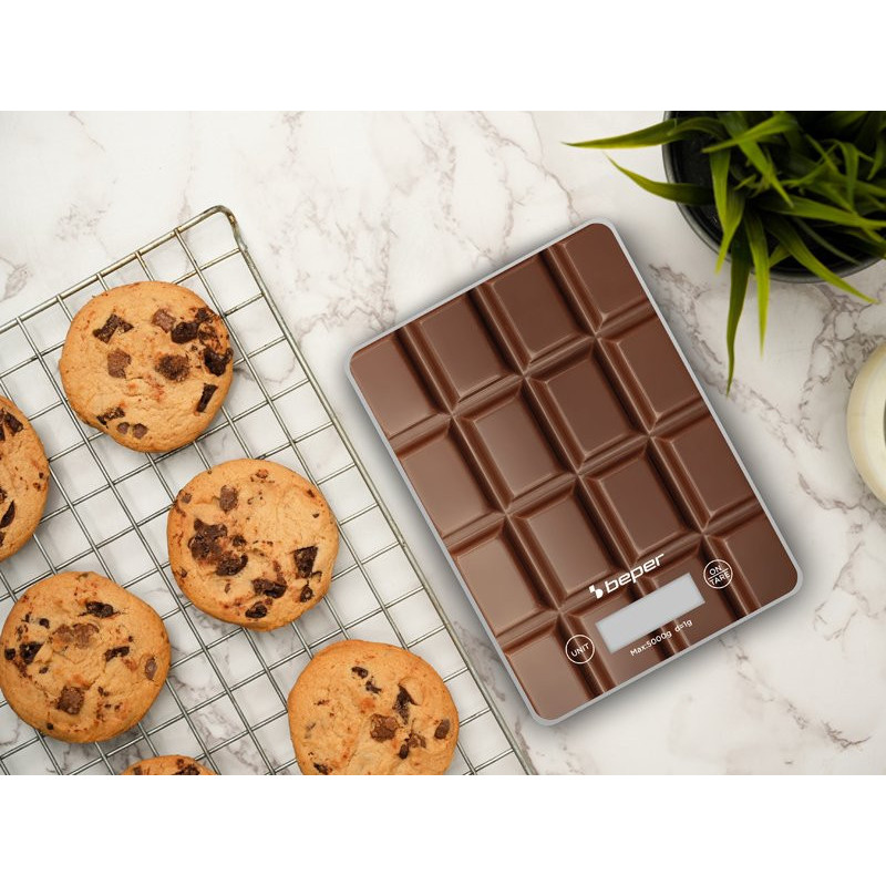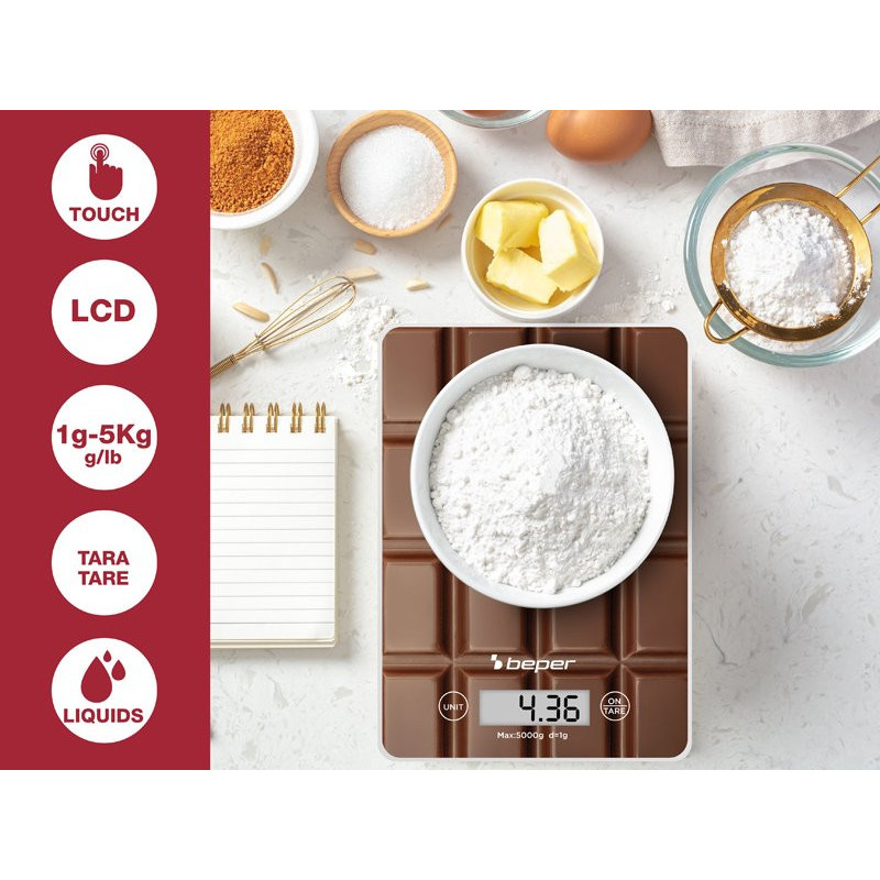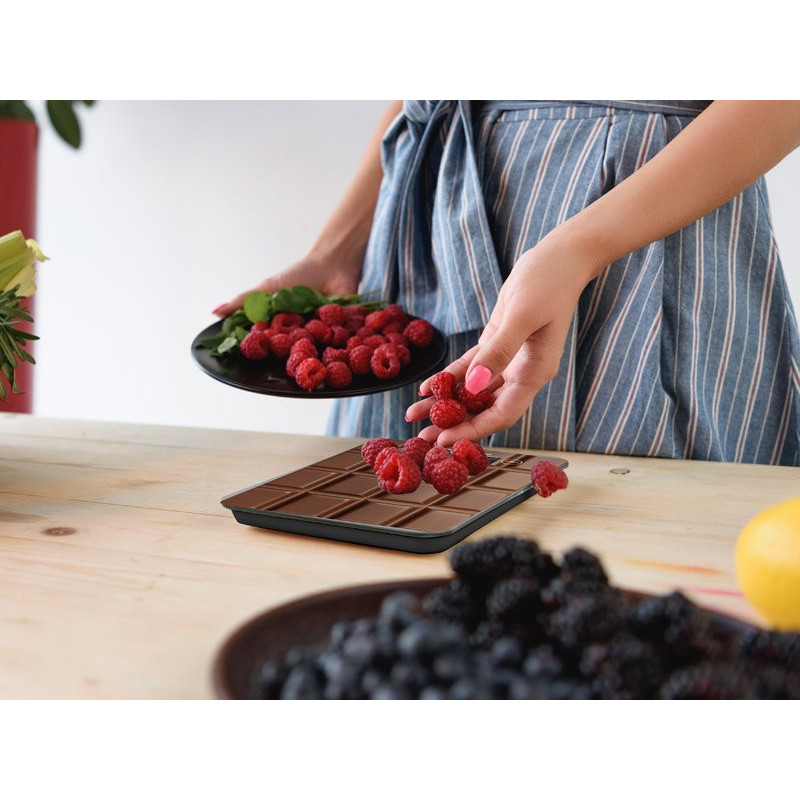 Vietą taupančios skaitmeninės virtuvės svarstyklės su novatoriška raštuota grūdinto stiklo plokštele ir taravimo funkcija, leidžiančia pasverti kelis maisto produktus iš eilės.