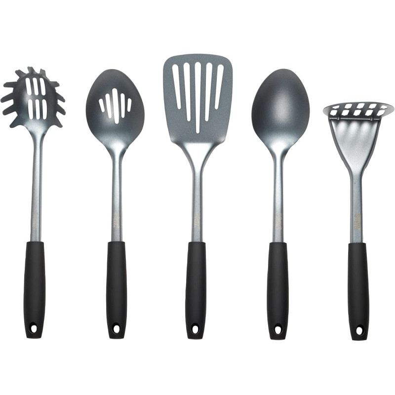 Šis daugiafunkcis rinkinys patenkins visus jūsų virtuvės poreikius. Jame yra kiaurasamtis ir mentelė, šaukštas spagečiams, šaukštas spagečiams ir grūstuvas.