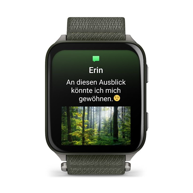 5.08 cm AMOLED jutiklinis ekranas su 448 x 486 pikselių rezoliucija. Savybės: GPS, širdies ritmo matuoklis, veiklos stebėjimas ir išmanieji pranešimai.