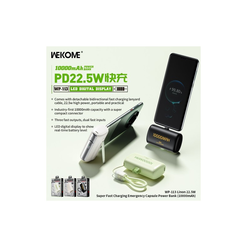 „WEKOME WP-113“ itin greito įkrovimo avarinė kapsulinė išorinė baterija (10000 mAh)