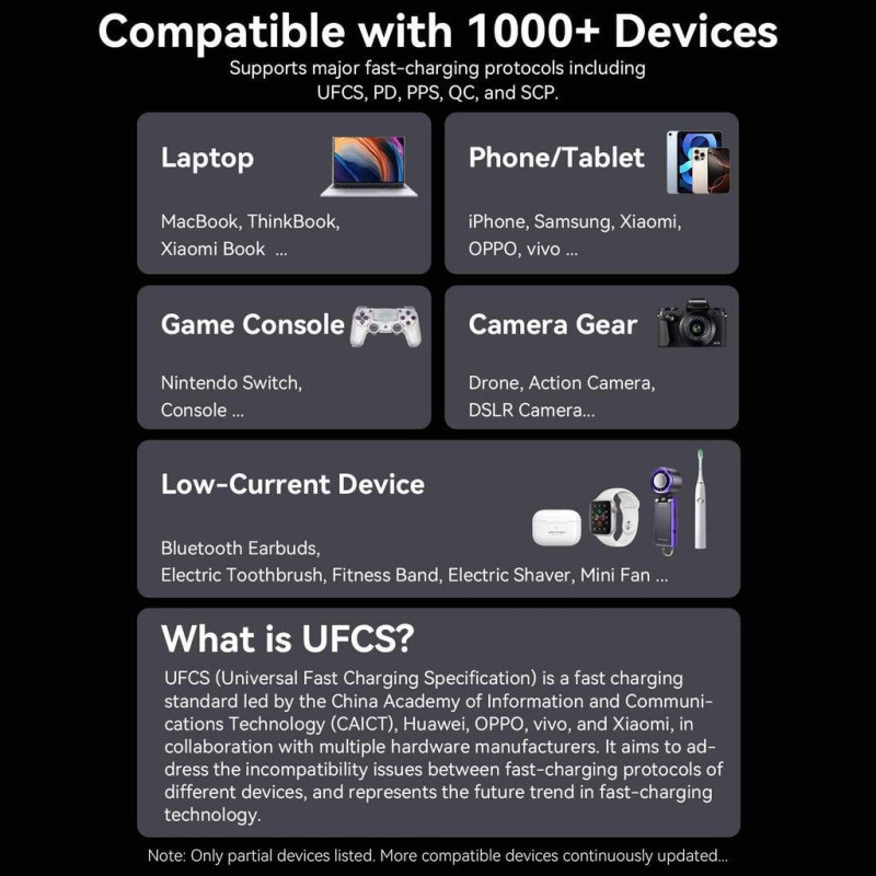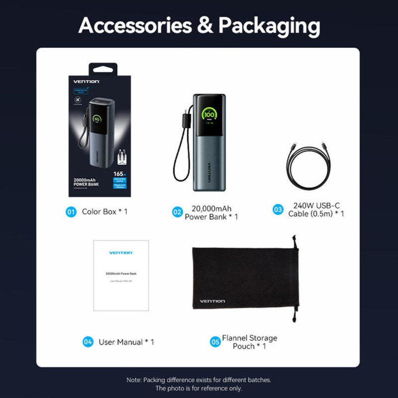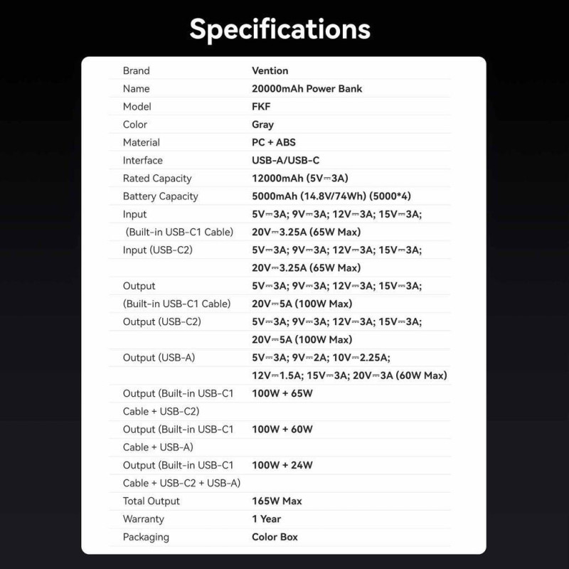 | Summary | Vention FKFH0. Battery capacity: 20000 mAh, Fast charging technology: Power Delivery 3.0, Programmable Power Supply (PPS). USB Type-A output ports: 1, USB Type-C ports quantity: 1. Total output power: 165 W, Output current: 5 A. Product colour: Grey |