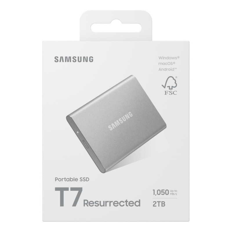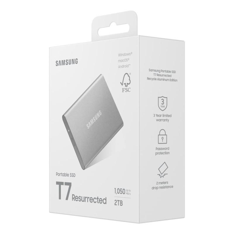 Long Description Samsung MU-PD2T0G/WW. SSD capacity: 2 TB. USB connector: USB Type-C, USB version: 3.2 Gen 2 (3.1 Gen 2). Read speed: 1050 MB/s, Write speed: 1000 MB/s. Data transfer rate: 10 Gbit/s. Password protection. Product colour: Silver