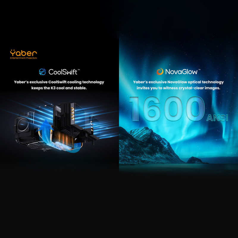 1600 ANSI liumenų ryškumo „Yaber K3“ projektorius užtikrina puikų vaizdo matomumą esant įvairiam apšvietimui, gerai veikdamas tiek tamsiose, tiek vidutinio ryškumo patalpose.