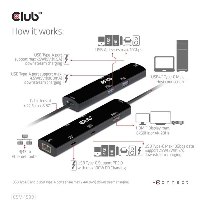 „Club 3D CSV-1599“ yra USB4™ Gen3x2 C tipo, 6 viename šakotuvas su HDMI™ 8K60Hz arba 4K120Hz, 2xUSB A tipo (10G), Ethernet RJ45 (2.5G) ir 2xUSB C tipo, 1x duomenų (10G) ir 1xPD3.0 įkrovimo 100 vatų prievadu. Šis adapteris siūlo integruotą vaizdo, duomenų, maitinimo ir Ethernet sprendimą. Jis turi HDMI™ (8K60Hz) vaizdo perdavimui, 3 USB duomenų prievadus (2 USB-A 10G, 1 C tipo 10G) duomenų perdavimui, 2.5Gbps Ethernet prievadą naršymui internete. Be to, šis adapteris turi C tipo PD3.0 įkrovimo prievadą su maksimalia 100 W maitinimo galia. Jis gali veikti su USB4™, „Thunderbolt4“, „Thunderbolt3“ ir DP Alt režimu (15 W skirta šio gaminio veikimui, likusi galia (daugiausia 85 W) bus skirta pagrindiniam įrenginiui įkrauti). Šis 6 viename šakotuvas veiks su visais DP Alt režimu palaikančiais C tipo pagrindiniais įrenginiais.
