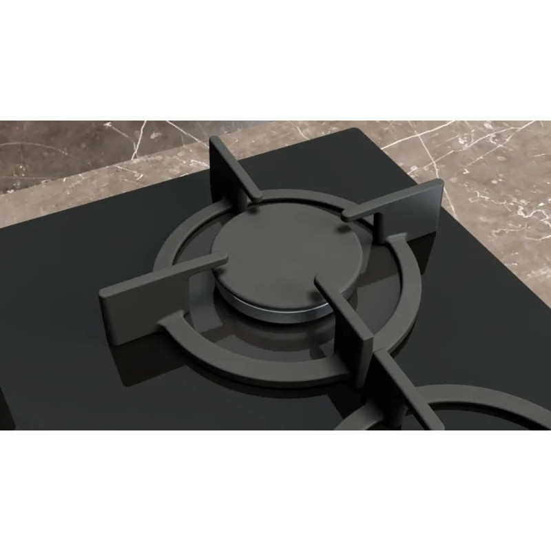 Įmontuojamas dujinė viryklė su keturiomis gaminimo zonomis, įskaitant didelę 3000 W zoną ir tris standartines zonas po 1750 W ir 1000 W. Tarp savybių yra elektroninis uždegimas, ketaus groteles ir grūdinto stiklo virimo paviršius.