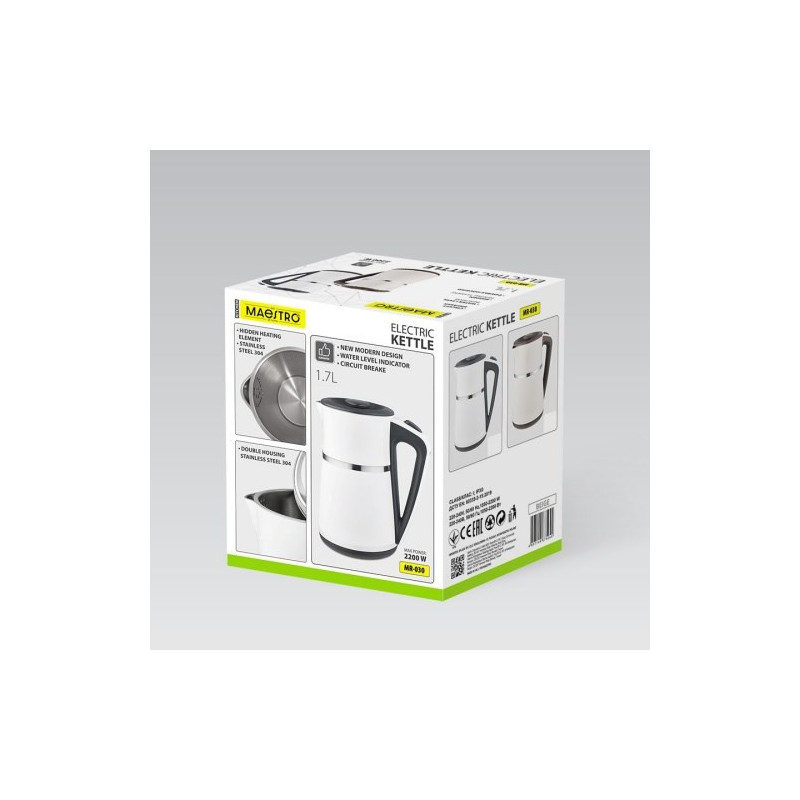 Feel-Maestro MR030 elektrinis virdulys turi 1,7 L talpos vandens rezervuarą ir veikia maksimaliu 2200 W galingumu. Jis pasižymi automatinio išsijungimo funkcija saugumui užtikrinti, o jo korpusas pagamintas iš plastiko ir nerūdijančio plieno.