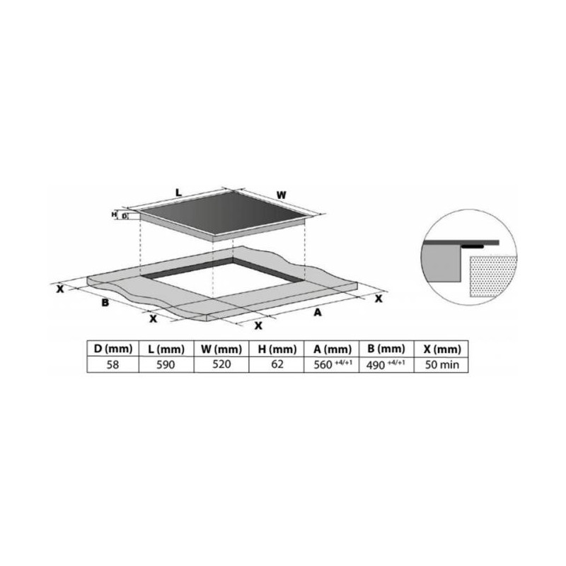 Indukcinės plokštės matmenys yra 6,2 cm x 59 cm x 52 cm.