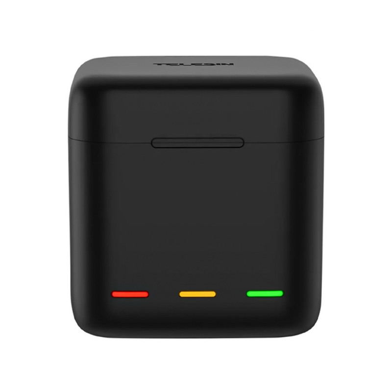 Funkcionalus ir kompaktiškas įkrovimo dėklas GoPro HERO9/10/11/12 su trimis baterijų lizdais. Siūlo USB-C įkrovimą, LED indikatorius ir papildomas vietas TF atminties kortelėms.