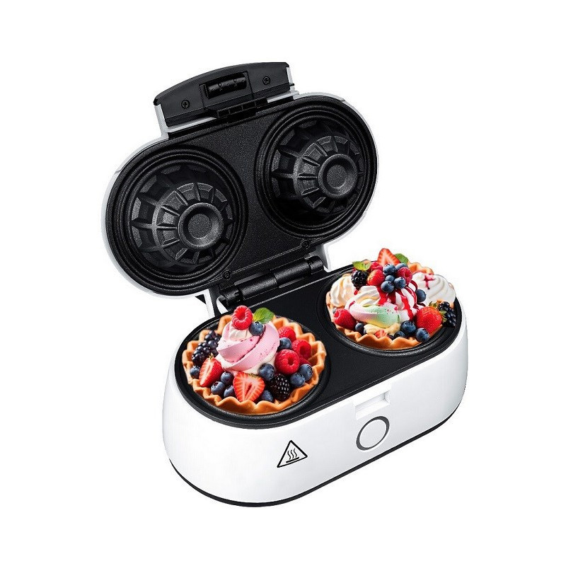VAFLIŲ DUBENĖLIŲ KEPTUVAS ADLER AD 3062 sukurtas vaflių dubenėliams gaminti su nelipnia danga, kad būtų lengva išimti. Jis veikia 1400 W galia su 230 V AC įtampa ir turi neslystančias kojas stabilumui naudojimo metu.