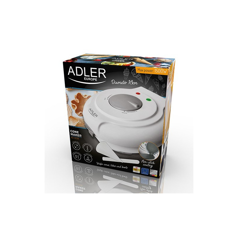 Adler AD 3038 waflinė turi 1500 W galingumą ir 180 cm kepimo paviršių, skirtą apvalių vaflių gamybai. Ji pasižymi nelipnia danga, reguliuojamu termostatu ir vertikalia laikymo galimybe.