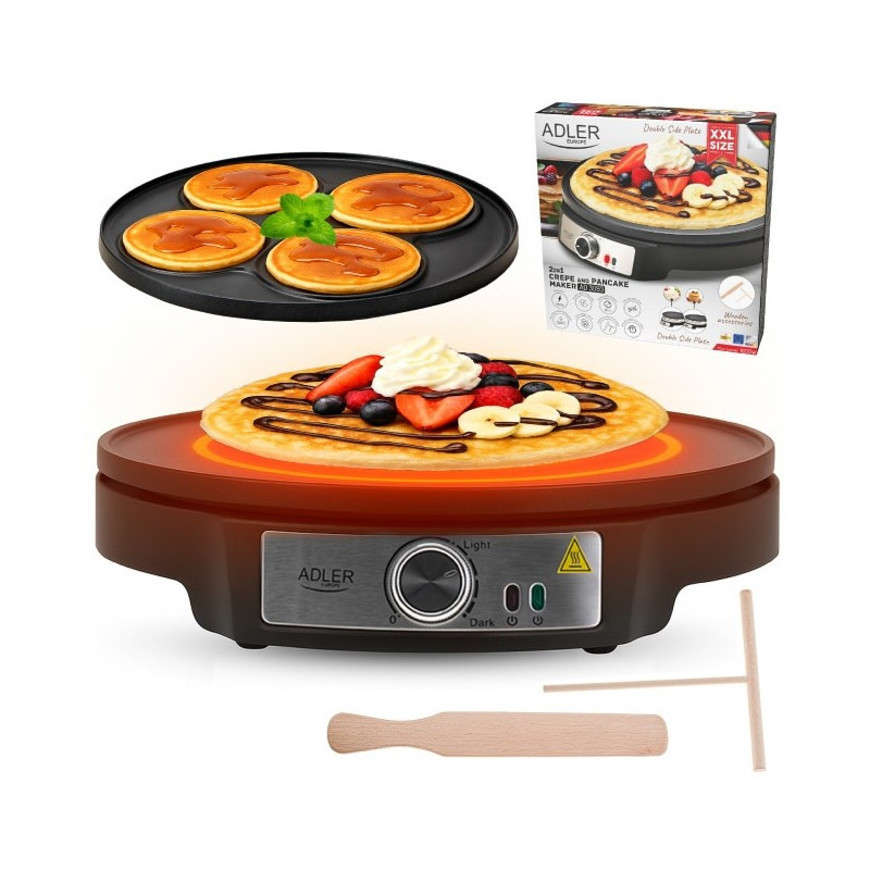 Adler AD 3093 yra dviejų pusių elektrinė blynų kepimo mašina su nelipnia danga ir reguliuojamomis temperatūros nustatymų galimybėmis. Ji turi nuimamą dvipusę plokštę ir kepimo paviršiaus skersmenį 30 cm, galia 1600 W.