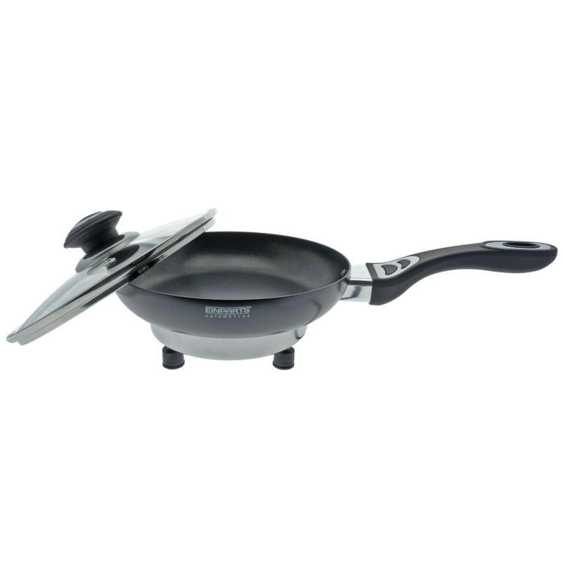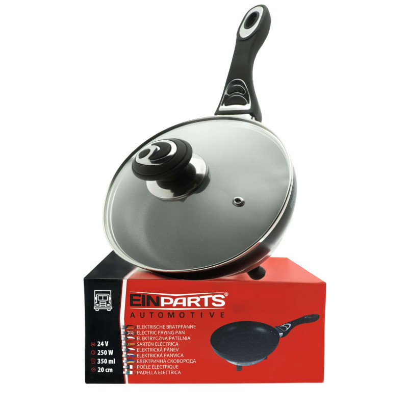 EPACC112 - 24 V automobilio elektrinė keptuvė, 20 cm skersmens, 250 W. Praktiška elektrinė keptuvė, maitinama 24 V cigarečių degiklio lizdu, idealiai tinka sunkvežimiams, mikroautobusams, kemperiams ir kitoms transporto priemonėms. Puikiai tinka kelionėms – leidžia greitai pašildyti ir kepti maistą be išorinių prietaisų. Aliuminio korpusas su nelimpančia danga leidžia lengvai kepti ir šildyti maistą, o stiklinis dangtis padeda išlaikyti šilumą. Rankena su minkšta gumine danga padidina patogumą ir saugų sukibimą. Keptuvės skersmuo yra 20 cm ir gylis 4 cm, kuris leidžia patogiai paruošti porciją vienam ar dviem žmonėms. Rinkinį sudaro grūdinto stiklo dangtis, kuris pagreitina maisto gaminimą ir neleidžia maistui taškytis. Techninės specifikacijos: