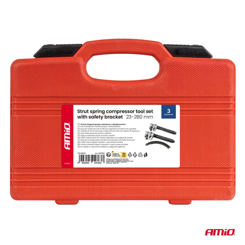 Profesionalus įrankių rinkinys, skirtas saugiam lengvųjų automobilių ir mikroautobusų pakabos spyruoklių nuėmimui ir montavimui. Komplekte yra apsauginis laikiklis, kuris padidina darbo saugą, sumažindamas atsitiktinio spyruoklių išsitempimo riziką esant didelei įtampai.