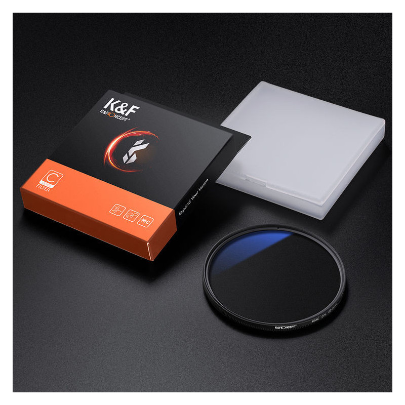 KF Concept KF01.1438 62mm Slim Blue Multi-Coated CPL Filter is a high-quality circular polarizer made of multi-coated optical glass that improves image clarity and color accuracy. It works by filtering polarized light reflecting off non-metallic surfaces, effectively reducing unwanted glare and reflections while increasing overall contrast.