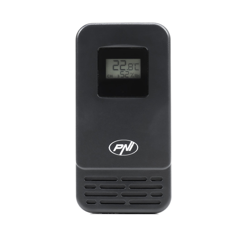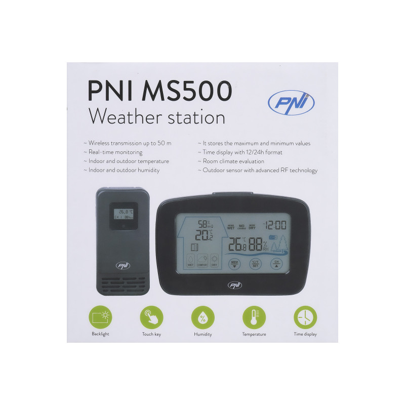 PNI MS500 meteorologinė stotis su belaidžiu išoriniu jutikliu, rodo vidaus ir lauko temperatūrą bei drėgmę, minimalių ir maksimalių klimato verčių atmintį
