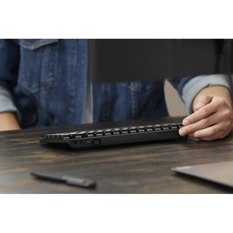 „ProArt Keyboard KD300“ turi trijų režimų ryšį, kad galėtų prijungti iki penkių įrenginių per 2,4 GHz belaidį ryšį, USB ir „Bluetooth“ – įskaitant nešiojamuosius, stalinius ir planšetinius kompiuterius.1 Galite lengvai perjungti įrenginius ir perjungti specialų kompiuterio / „Mac“ jungiklį, kad akimirksniu pritaikytumėte klaviatūros išdėstymą pagal pageidaujamą operacinę sistemą. Be to, įmontuotas magnetinio adapterio laikymo lizdas suteikia patogų ir saugų būdą laikyti adapterių lengvai pasiekiamoje vietoje.