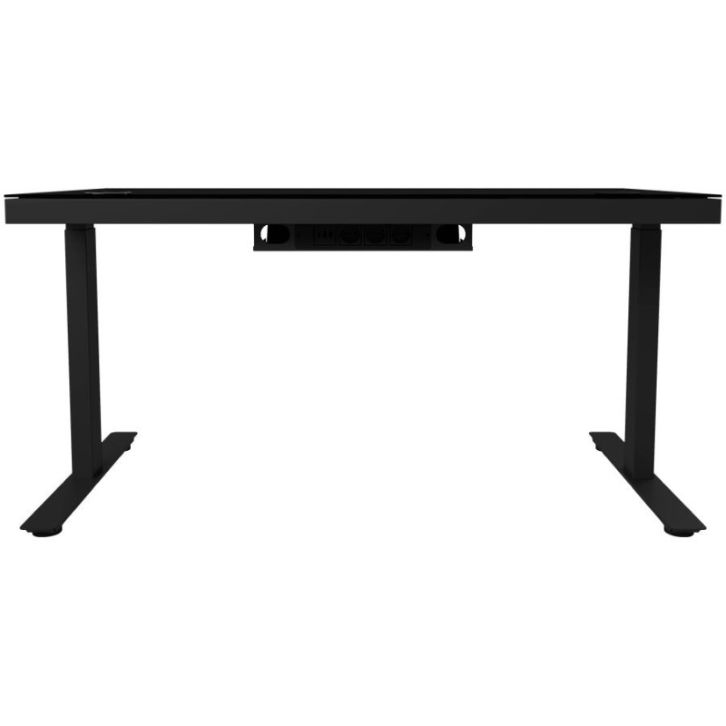 Dviejų variklių reguliuojamo aukščio žaidimų stalas su reguliuojamo aukščio reguliuojamo aukščio stumdomu/stovinčiu paviršiumi, belaidžiu įkrovikliu, RGB apšvietimu, valdymo pultu ir USB prievadais, tvirtu grūdinto stiklo stalviršiu, juodos spalvos.