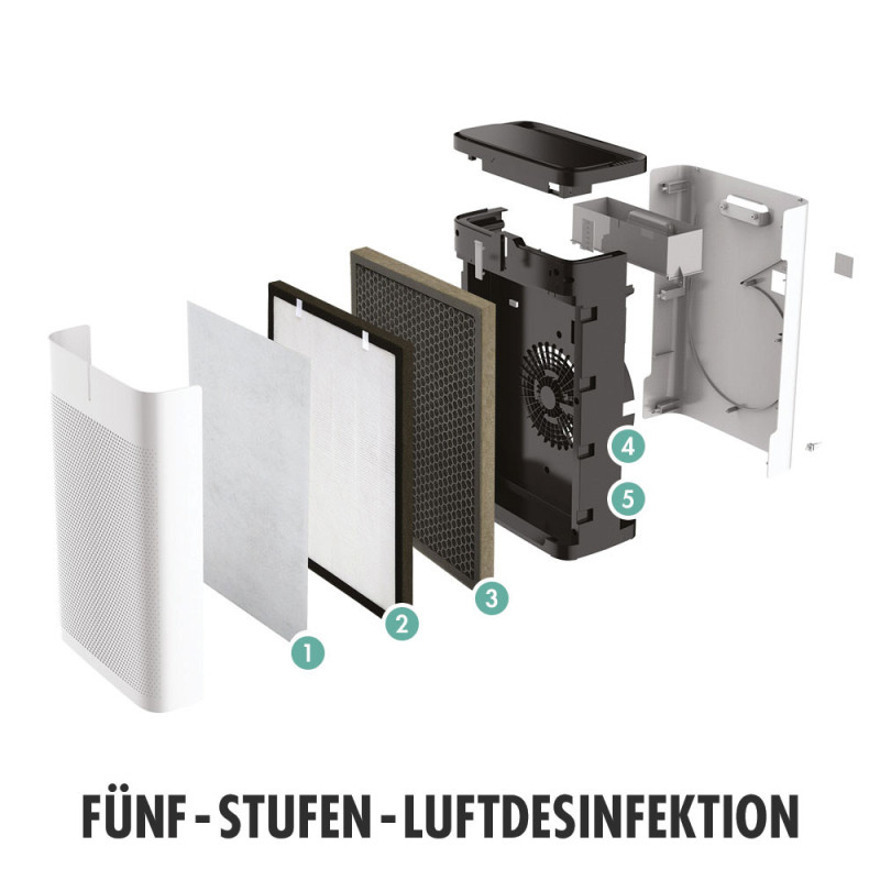 • Novatoriška penkių pakopų oro dezinfekcija ir filtravimas nenaudojant cheminių medžiagų su kietųjų dalelių jutikliu (PM2,5) oro kokybei stebėti