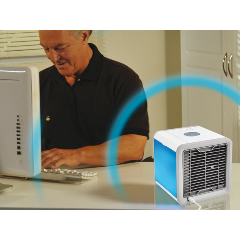 Kompaktiškų matmenų mini aušintuvas, valdomas per pridedamą USB laidą. Gaivina, drėkina ir valo orą. 3 pasirenkami greičiai ir 7 keičiamos LED spalvotos lemputės. Reguliuojamas priekinių grotelių pasvirimas oro srovei nukreipti. 750 ml talpos bakas, kurio veikimo laikas iki 8 valandų.