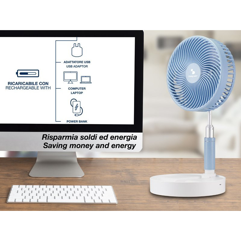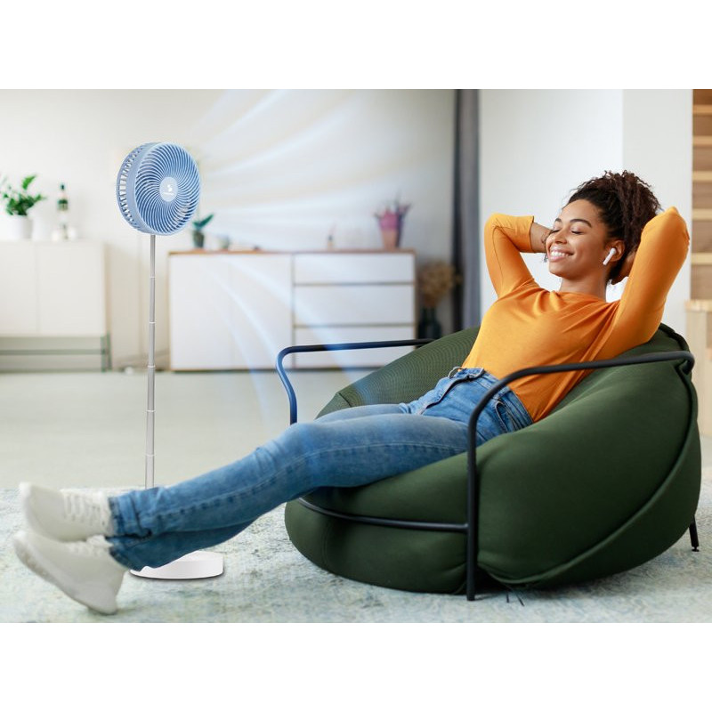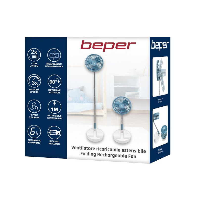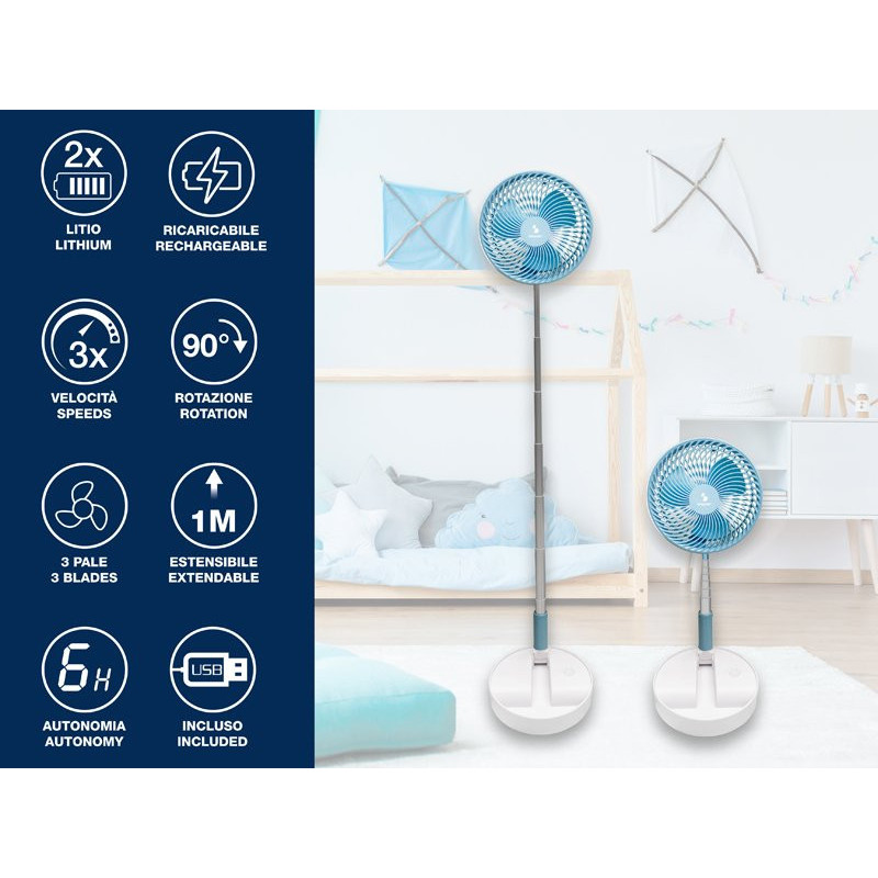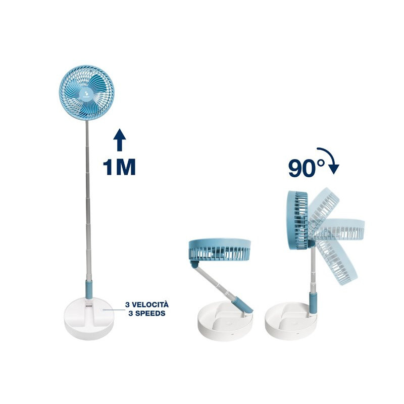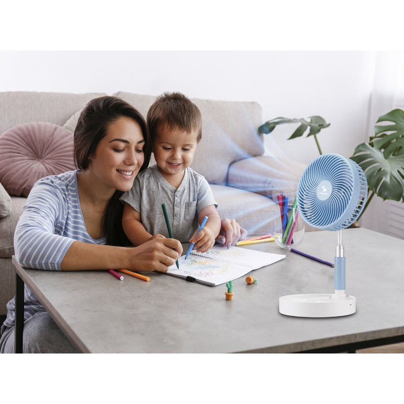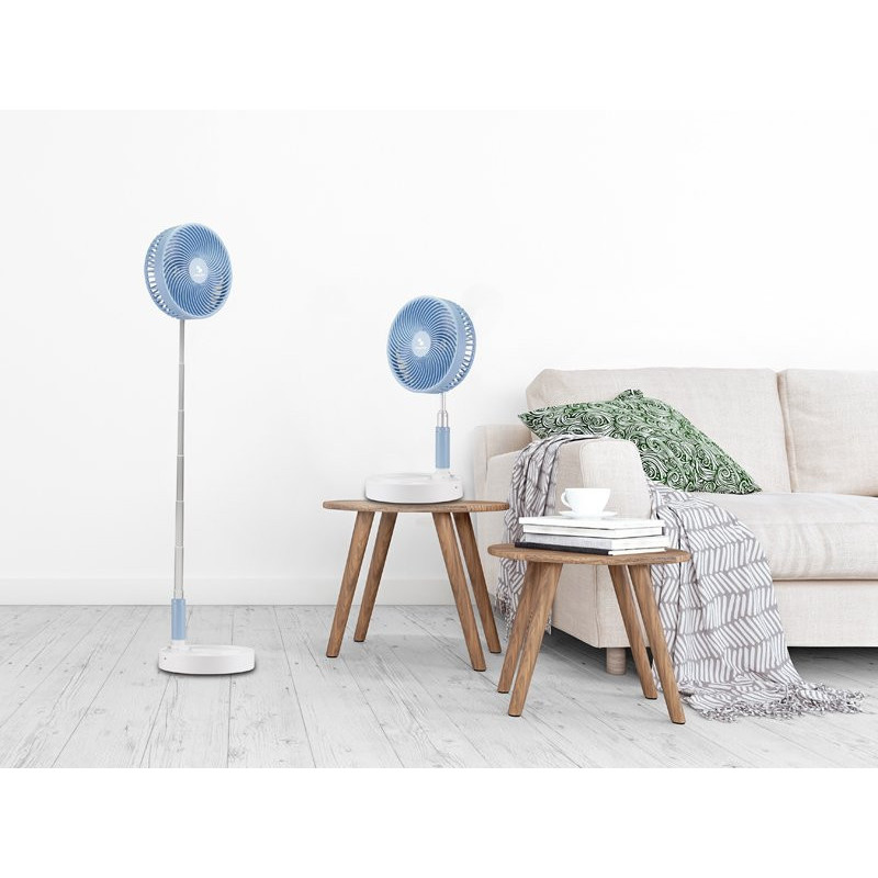 Šis mažas įkraunamas ventiliatorius puikiai tinka atsigaivinti kiekvieną dienos akimirką. Dėl ištraukiamo teleskopinio koto, kurio ilgis siekia iki 1 m, jis akimirksniu gali transformuotis iš stalo ventiliatoriaus į grindų ventiliatorių.