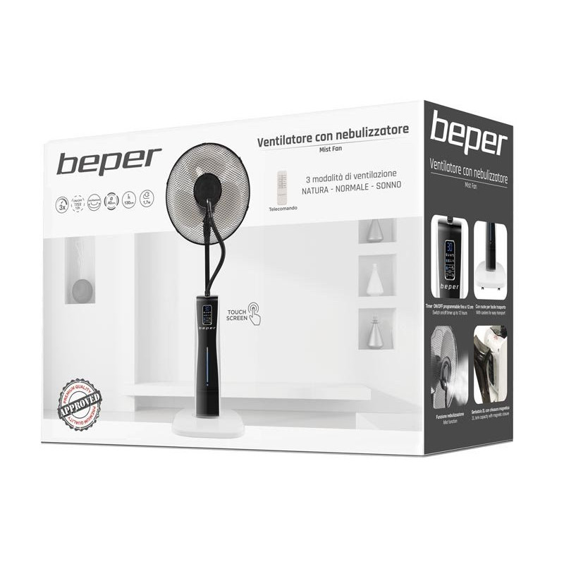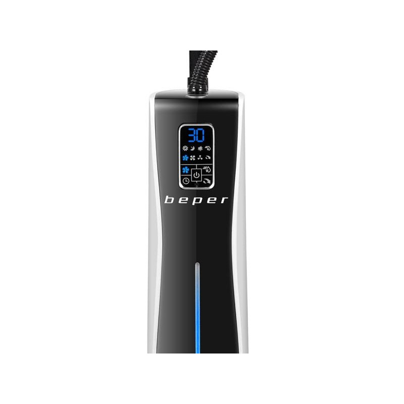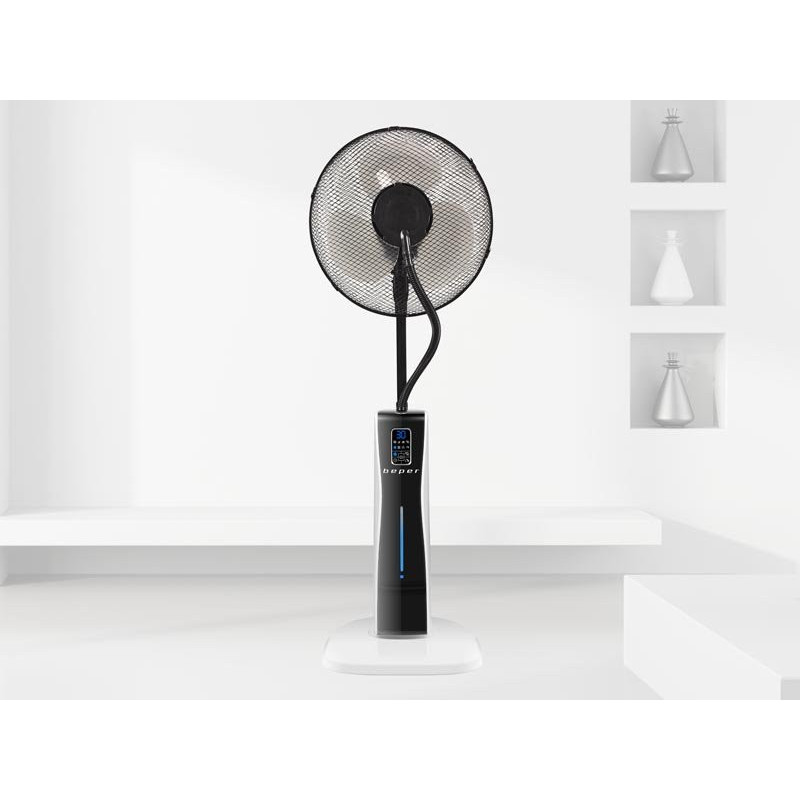 Ventiliatorius su moderniu ir praktišku dizainu. Šis ventiliatorius idealiai tinka gaivumui suteikti bet kokioje namų aplinkoje, nes jame yra skaitmeninis valdymo skydelis su purškimo funkcija, 3 veikimo režimai (įprastas, vėjo ir naktinis) ir 3 pasirenkami greičiai. Laikmatis iki 12 valandų, programuojamas ir patogiu nuotolinio valdymo pultu. Automatinis horizontalus siūbavimas ir integruotas 2 litrų vandens bakas. Pridedami ratukai leidžia jį perkelti ir pastatyti bet kuriame kambario kampe.