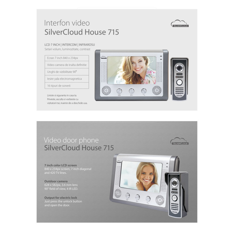 „SilverCloud House 715“ vaizdo domofonas, 7 colių LCD ekranas, lauko kamera, naktinio matymo funkcija, elektromagnetinė „yala“ išvestis