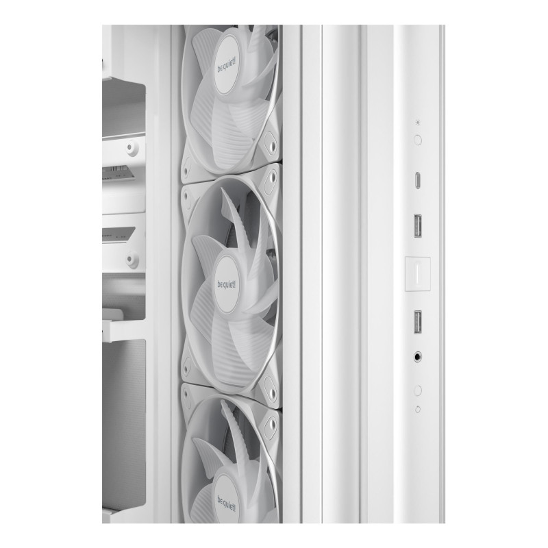 Kampuotas ventiliatoriaus rėmas šone ne tik liudija eleganciją ir funkcionalumą, bet ir nukreipia daugiau oro į GPU – dalį, kuriai tradiciškai jo reikia daug. Jame yra tvarkinga išpjova, kuri veikia kaip efektyvus oro įsiurbimas. Kad būtų lengva sumontuoti ventiliatorius, jis išstumiamas į viršų. Kabelių valdymas yra lengvesnis nei bet kada anksčiau, nes kanalas elegantiškai paslepia jūsų įrangą. Jei apačioje įrengsite papildomus ventiliatorius, jie puikiai susilygiuos su korpuso dugnu dėl nuleistos ventiliatoriaus nišos.
