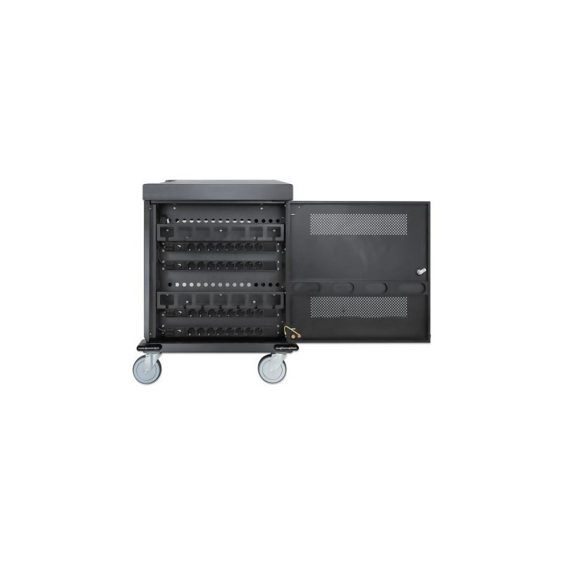 „Manhattan“ nešiojamųjų kompiuterių įkrovimo vežimėlis su kintamosios srovės adapteriu (ES), 32 lizdai, įrenginio kintamosios srovės adapterio (maitinimo laido) įdėjimas į įrenginį, tinka VISIEMS nešiojamiesiems kompiuteriams (iki 15,6 colio), „iPad“, „MacBook“, „Chromebook“ ir kitiems USB-C įrenginiams, lizdai 380 x 30 x 280 mm, spintelė, užrakinamas