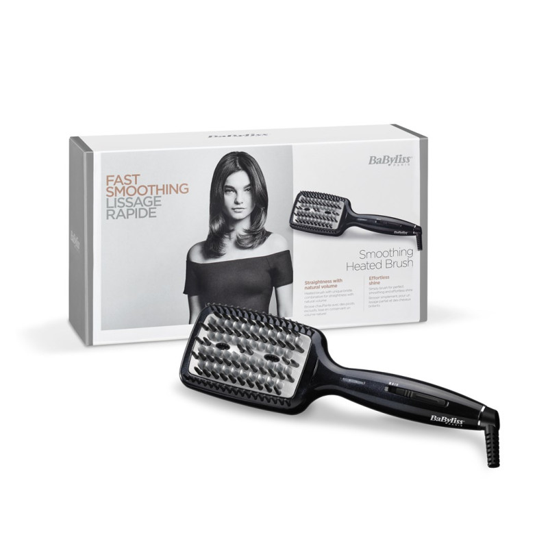 BaByliss Smoothing Heated Brush turi keraminį paviršių ir reguliuojamą termostatą su trimis šildymo lygiais, tinkamais visiems plaukų tipams. Įšilimo laikas yra 30 sekundžių, o temperatūra gali siekti nuo 160 °C iki 200 °C, užtikrinant efektyvų plaukų tiesinimą.