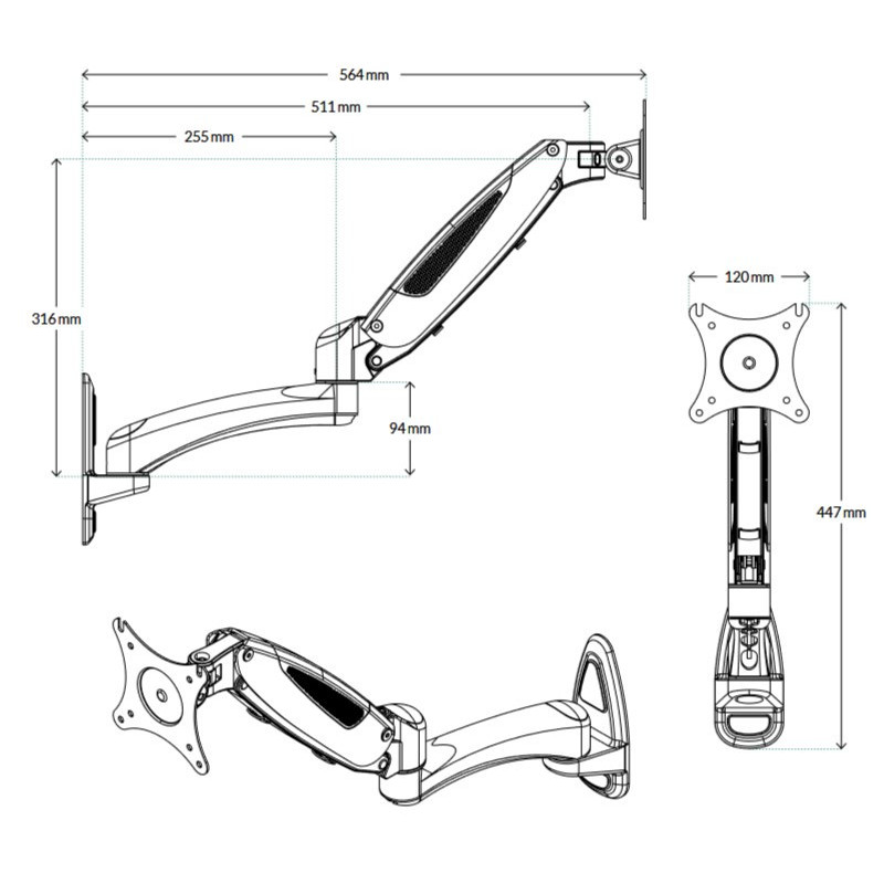 Tvirtos plieninės konstrukcijos stovas stabiliai išlaiko iki 49 colių plačiaekranį monitorių arba iki 43 colių 16:9 kraštinių santykio ekraną, sveriantį iki 8 kg. Skirtas tvirtinimui prie sienos. Ištraukiama spyruoklinė rankena.