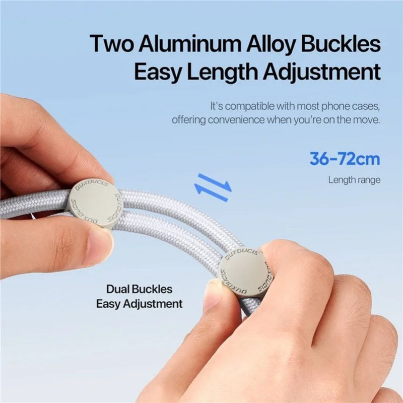 „DUX DUCIS Plaz“ – tai telefono virvelė, sukurta atsižvelgiant į maksimalų komfortą ir funkcionalumą. Daugiafunkcis dizainas leidžia nešioti telefoną tiek ant peties, tiek ant kaklo, todėl jis idealiai tinka įvairioms situacijoms ir suteikia laisvų rankų patogumą. Reguliuojamas virvelės ilgis leidžia ją pritaikyti prie individualių poreikių, o tai padidina naudojimo patogumą.