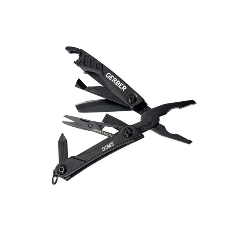 Gerber Dime Black - kompaktiškas ir lengvas (62 g) sulankstomas multitool su 10 funkcijų, pagamintas iš patvaraus nerūdijančio plieno, užtikrinantis maksimalų funkcionalumą kasdieniam naudojimui.