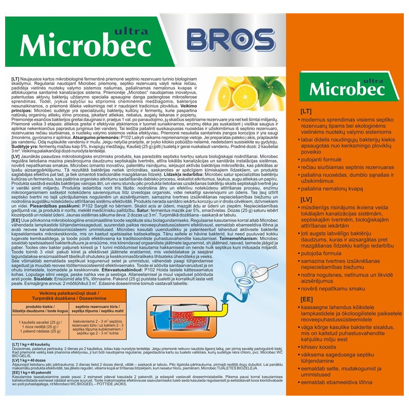| Papildoma informacija | Mikrobiologinė priemonė, kuri palengvina biologinio valymo procesus vietinėse kanalizacijos sistemose. Reguliarus MICROBEC naudojimas mažina nešvarumų kiekį vandens talpoje, valo kanalizaciją ir sanitarinių įrenginių sistemas, šalina nemalonius kvapus |