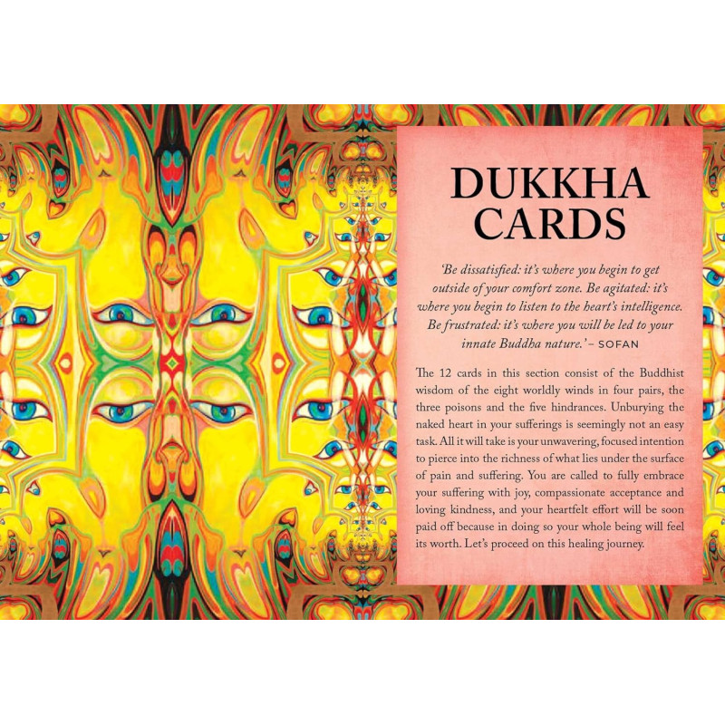 Jei jaučiatės įstrigę tarp proto minčių ir kūno jausmų, čia jums lengvai prieinama gydomoji įžvalga. Perženkite vilties ir beviltiškumo ribas, priimdami Budos Dhammą į savo erdvią širdį ir leisdami apmąstymams bei kontempliacijai vykti natūraliai. Dauguma mūsų nėra tinkamai susipažinę su savimi iš beribės širdies užuojautos. Mūsų proto versija apie save dažnai būna prisodrinta nuosprendžių ir iškreiptų nuomonių. Kur yra jūsų tikrasis "aš"? Budos Dhammos orakulą sudaro 36 pagrindinės įžvalgos iš didžiosios budizmo išminties, vadinamos Budos Dhamma. Šios įžvalgos yra tiesioginis atsakas į žmogiškosios būsenos esmę sudarančias įtampas, kurias mes visi patiriame per savo gyvenimą; įtampas, kurias klaidingai laikome kančiomis. Intymus tiesos dialogas tarp jūsų širdies ir Budos Dhammos atkurs kilnų ryšį su jūsų esme.