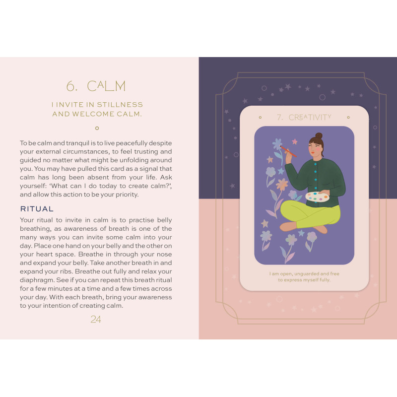 Šioje 36 kortelių kaladėje rasite sielos gaires, kasdienes praktikas ir dėmesingumo įrankius, padėsiančius įsisavinti savo vidinę išmintį. Gaukite gaires, kurių ieškojote, kad padėtų jums išreikšti savo troškimus, praktikuoti užuojautą sau ir prisijungti prie savo intuicijos. Šios kortelės buvo sukurtos taip, kad būtų suderintos su dviem kostiumais: ketinimų kortelės suteikia jums ketinimą ir kasdienę dienos praktiką. Tai apima pranešimą, mantrą ir ritualą, su kuriuo galite dirbti. Išminties kortelėse yra orientacinis patvirtinimas, leidžiantis suderinti savo sielos vidinę išmintį. Kasdien naudokite šias korteles patarimui ir ketinimams. Kiekviena korta - tai kvietimas sugrįžti į dabarties akimirką; kad pristabdytumėte ir gautumėte nurodymus, kurių jums reikia, parodykite savo tikriausią save. Naudokite šiuos pranešimus, kad kiekvieną dieną susisietumėte su savo aukščiausiu aš.