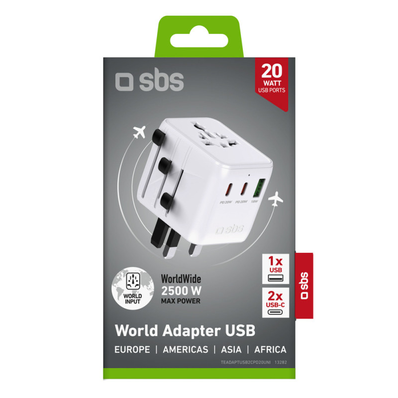 SBS universalus kelioninis adapteris 2xUSB-C 1xUSB-A - baltas
