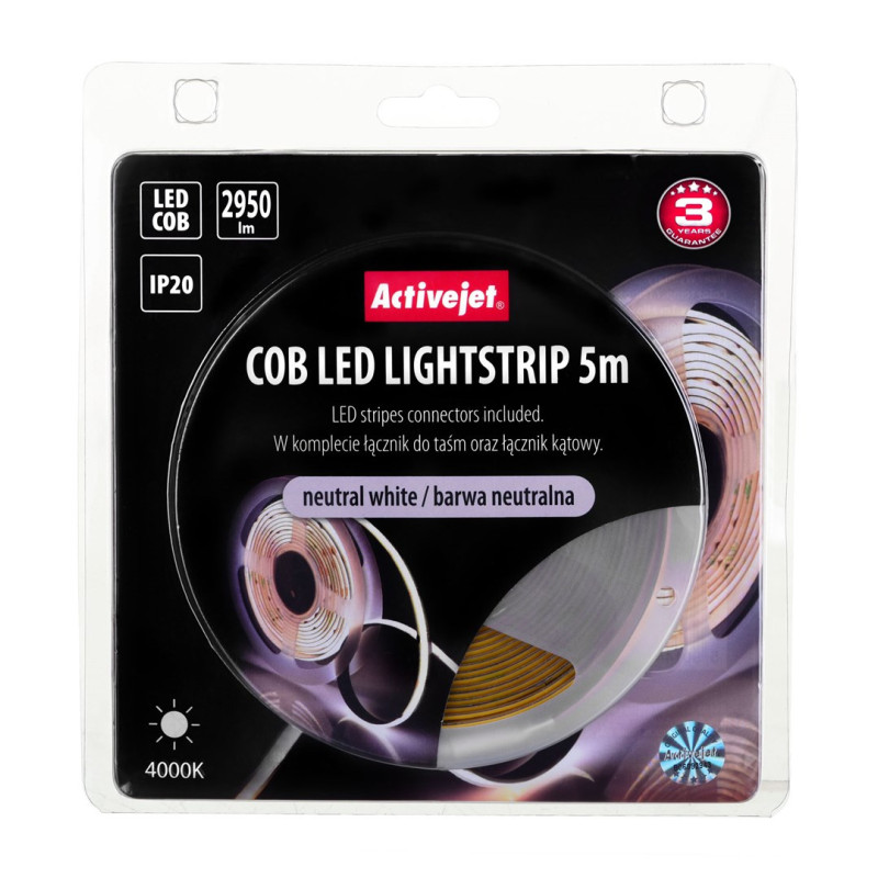 Activejet AJE-COB 5m Neutrali Juostinė Šviesa yra universali apšvietimo sistema, skirta patalpoms. Su energijos efektyvumo klase F, ji skleidžia 2950 lumenų neutraliai baltą šviesą, užtikrinančią komfortišką ir efektyvų apšvietimą.