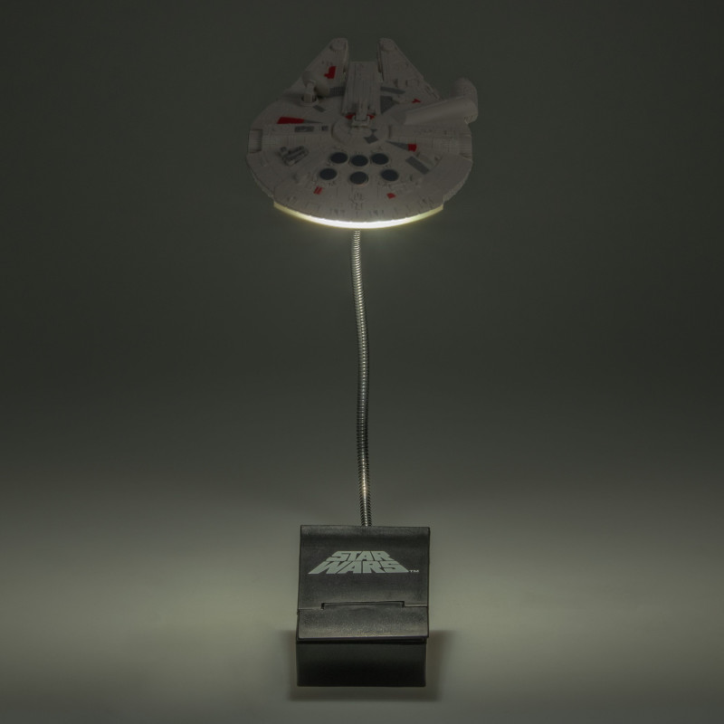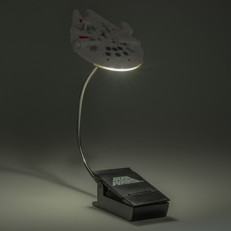 Prisegamas skaitymo šviestuvas turi 20 cm lankstų laidą, kurį galima pakreipti norima kryptimi. Viršuje yra priekinis šviestuvas, kurio forma primena patikimą Hano Solo laivą ir kuris šviečia įjungtas.