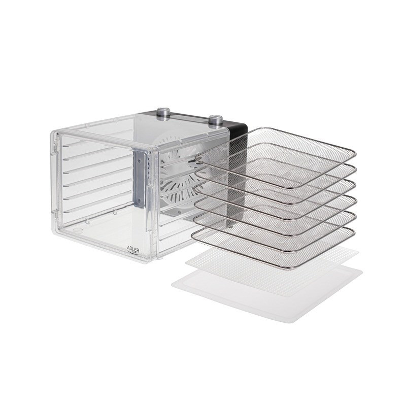 Adler AD 6660 maisto džiovintuvas turi sulankstomą dizainą, šešis džiovinimo režimus ir reguliuojamą termostatą. Jame yra šeši tinkleliai, integruota ekranas, lengvai valomas, o galingumas siekia 600 W.