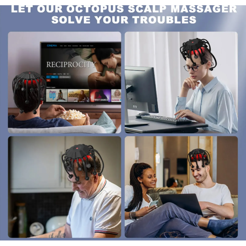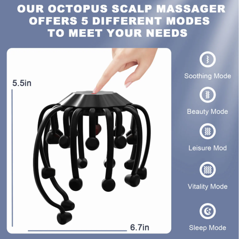 Octopus – tai modernus galvos masažo įrenginys, sukurtas suteikti profesionalaus masažo pojūtį namuose. Jo ergonomiškas „aštuonkojo“ dizainas leidžia masažuokliui prisitaikyti prie galvos formos ir pasiekti didesnį galvos odos plotą.