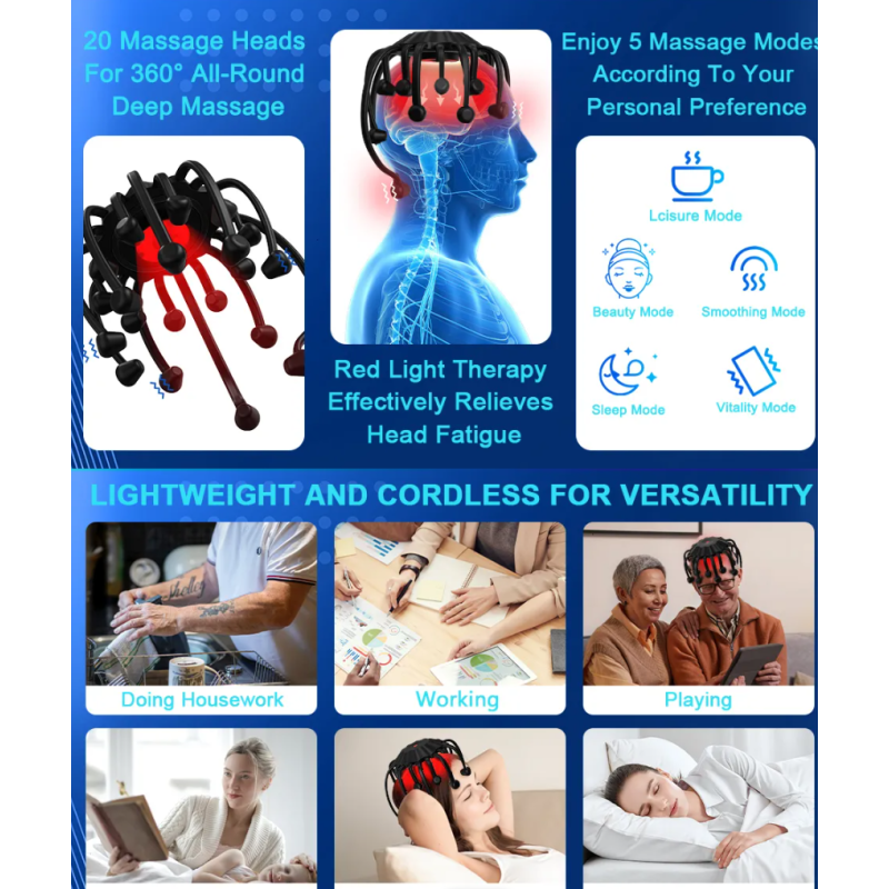 Octopus – tai pažangus elektrinis galvos masažuoklis, skirtas giliam atsipalaidavimui, streso mažinimui ir galvos odos stimuliacijai. Įrenginys turi 20 lankščių masažo kontaktų, 5 skirtingus masažo režimus, integruotą raudonos šviesos terapiją ir Bluetooth funkciją, leidžiančią klausytis mėgstamos muzikos masažo metu. Tai modernus būdas mėgautis SPA tipo galvos masažu patogiai namuose.