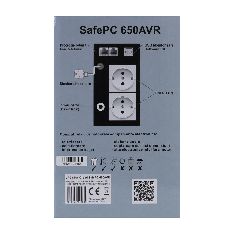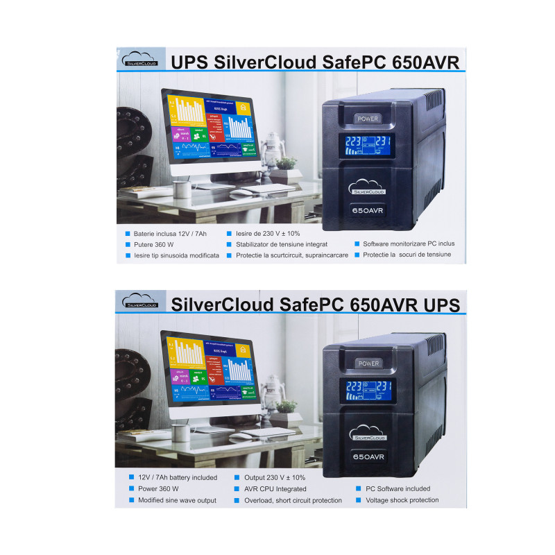 UPS „SilverCloud SafePC 650AVR“ galia, 360 W, LCD ekranas, kompiuterio stebėjimo programinė įranga